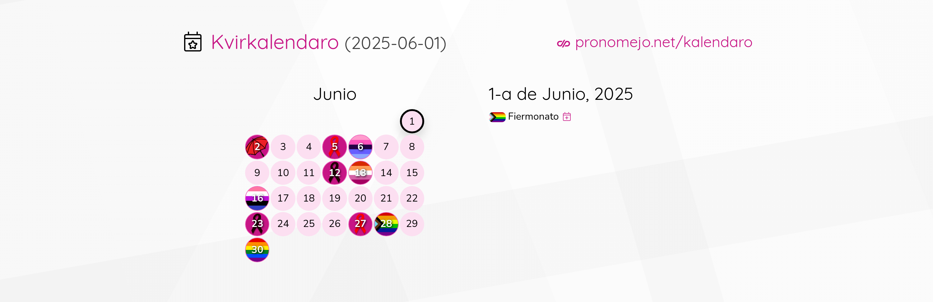 Alternativa teksto: A rectangular flag with six equal-width horizontal stripes: red, orange, yellow, green, blue and purple; a chevron (triangle) on the left side composed of stripes of the following colours (from the left): white, pink, light blue, brown, black Fiermonato