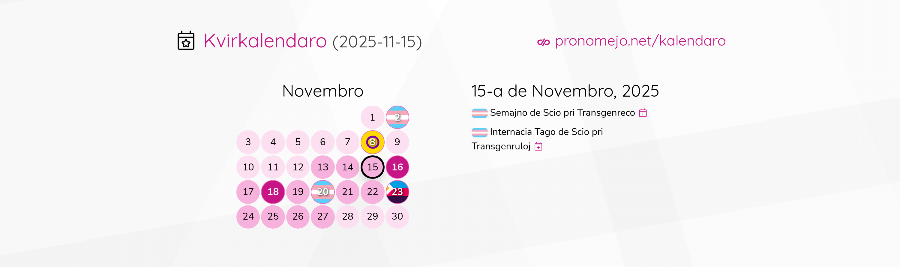 • A rectangular flag with five equal-width horizontal stripes: blue, pink, white, pink, blue A rectangular flag with five equal-width horizontal stripes: blue, pink, white, pink, blue Alternativa teksto: A rectangular flag with five equal-width horizontal stripes: blue, pink, white, pink, blue Internacia Tago de Scio pri Transgenruloj